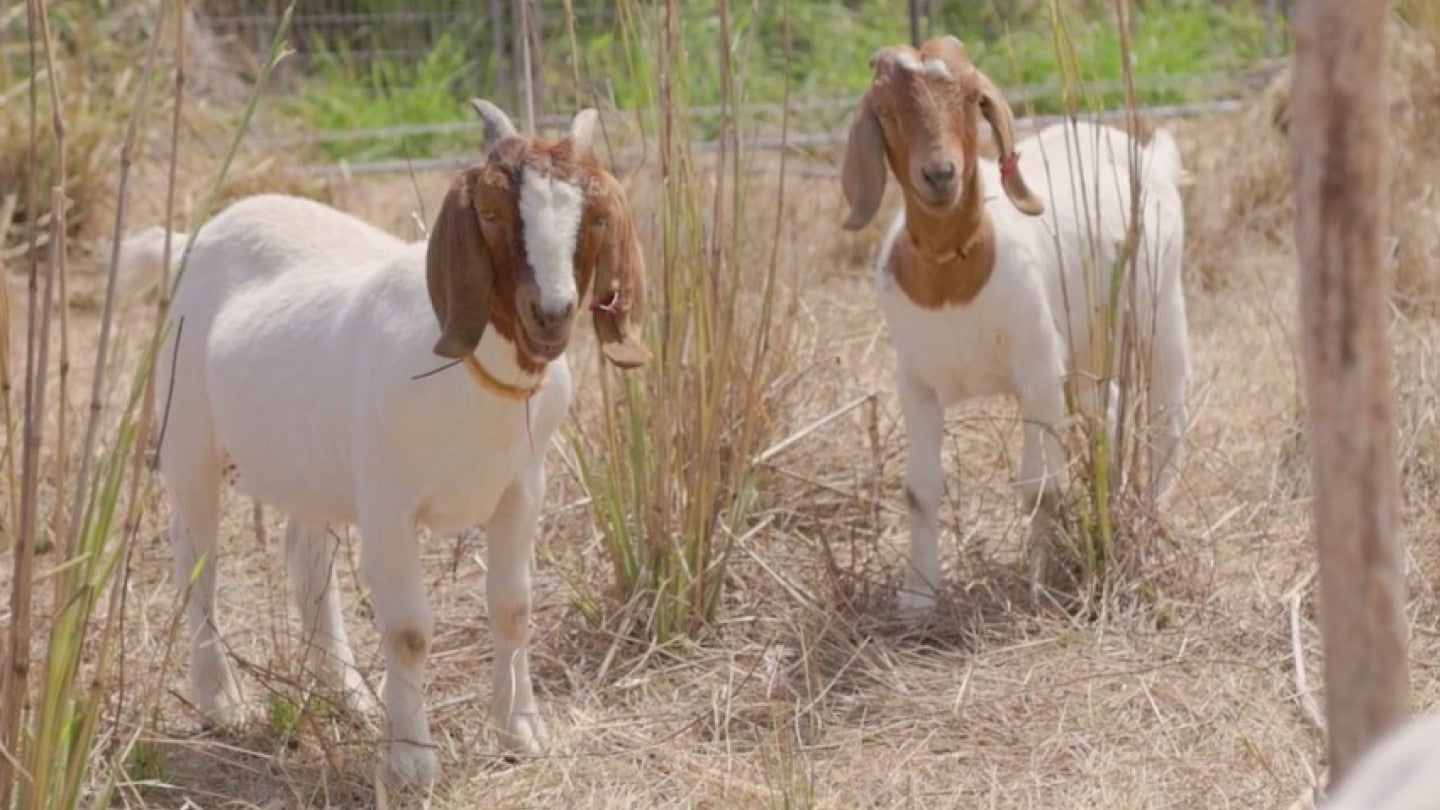 The herd of 15 goats has been deployed to cut down tall grass and weeds near Tully railway station in Far North Queensland as an alternative option to manage the overgrown vegetation.