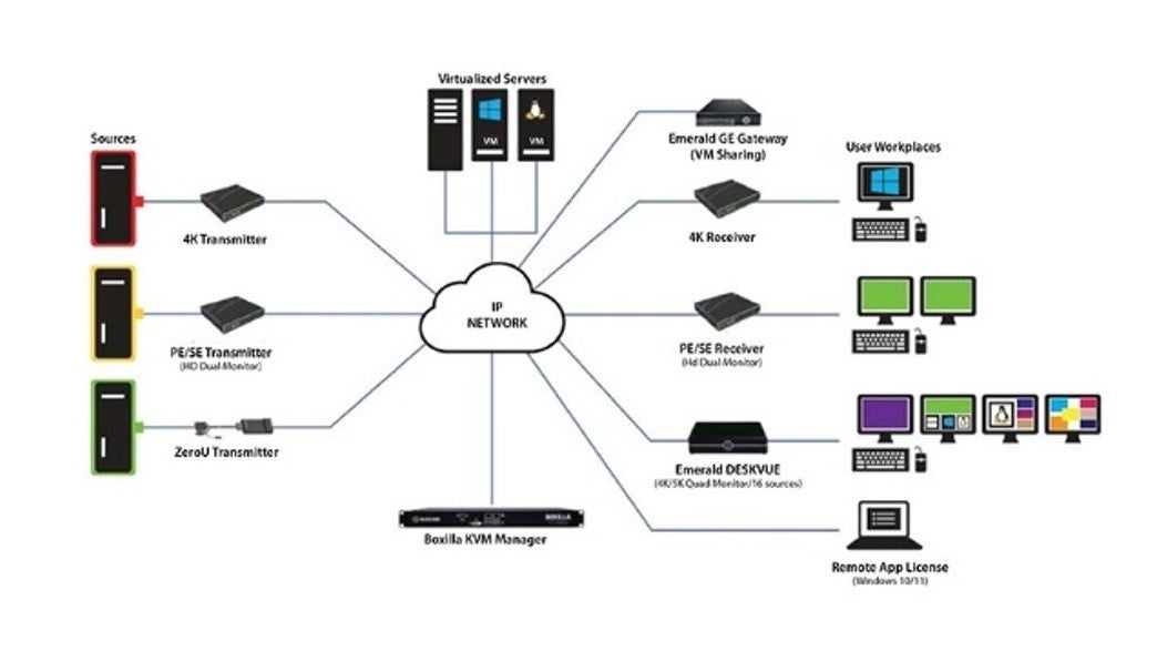 Emerald Unified KVM links remote virtual and physical servers to users next door, across a campus, or anywhere in the world. Black Box Emerald KVM extenders switch and extend pixel-perfect video in up to 4K, are built for 24/7 operation, integrate with standard IT infrastructure, are highly scalable, and use low network bandwidth.