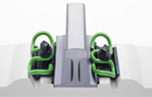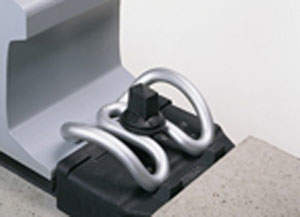 The 300 rail fastening system for slab tracks, which can be pre-assembled, is suitable for all methods of slab track installation. The highly elastic intermediate plate substitutes for the elasticity of the ballast bed. A steel pressure distribution pad, which supports the rail through the interposition of conventional rail pads, is used to improve the load distribution on the intermediate plate.