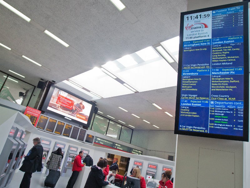 Each one features a 98in effective display area comprising four 46in TFT panels which have a minimal bezel and are mounted to give the impression of a single screen. This huge canvas has been divided up into eight virtual regions, which work as next train indicators, summary of departures, summary of arrivals, next fastest train and a special ‘Virgin fastest train to London’.