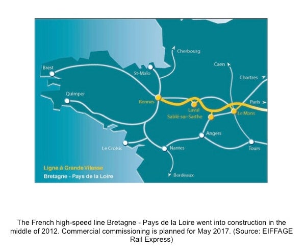 The LGV (Ligne à grande vitesse) Bretagne-Pays de la Loire is a French high-speed line, which went into construction in the middle of 2012. It will extend the LGV to the Brittany region from Le Mans to Rennes. Commercial commissioning is planned for May 2017. The project will be spearheaded by the French construction company EIFFAGE for the network owner RFF (Réseau Ferré de France) as part of a public-private partnership. The LGV BPL line will be 214km long.