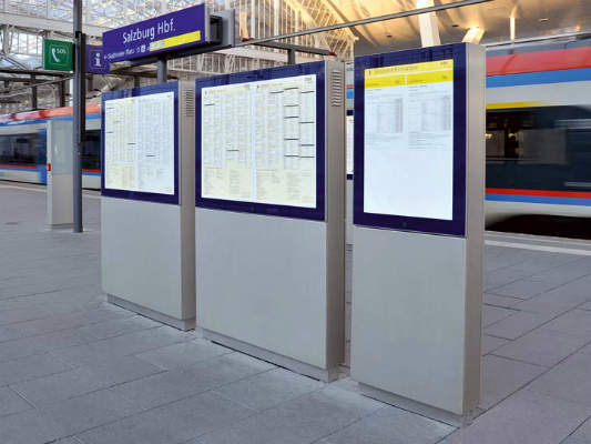 Modern passenger information systems are equipped with static and dynamic elements. High-resolution monitors in combination with backlit paper schedules allow all passengers access to the necessary information within a terminal and on the platform.