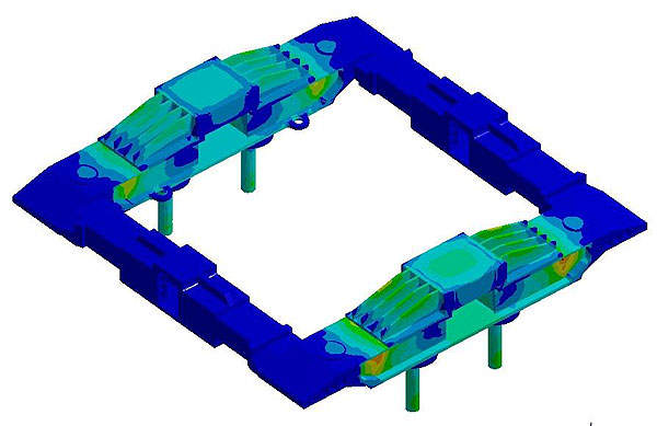 Special bogie-underframe connection used to test on the existing locomotive E402B, an experimental bogie (image from the FEM analysis).