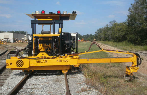 The KTR 400 Tie Replacer is an efficient tie exchanging machine that uses hydraulically powered clamps and arm to effortlessly remove old ties and replace them.