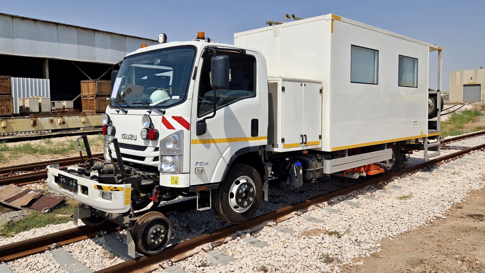 The road-rail vehicle is equipped with a container welding machine for rail resistance welding in off-road conditions. Both rail adapters are double-axle and are located behind the road axles, with hydraulically driven rail adapters. The actuator can be controlled using a remote control and the vehicle is equipped with direct-acting, parking, braking, and emergency braking. A rear swivel chassis with micro carriage facilitates rail positioning and the welding head is equipped with a built-in tensioner. The machine is also equipped with a video surveillance camera system for reversing, emergency stop buttons along the machine, track lighting, and a lighting system for working in the dark. The welding unit is designed for flash-butt welding rails with a maximum rail cross-section area of 6500mm2-10000mm2.