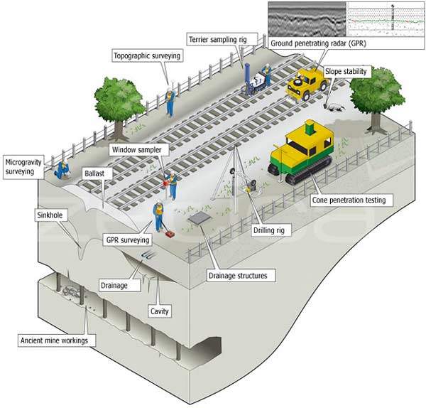 - Subsidence: former mine workings and in-filled sinkholes can represent a significant risk to the safety of a railway – a range of geophysical methods suited for use in the trackside environment are offered that can help identify the location, depth and size of structures