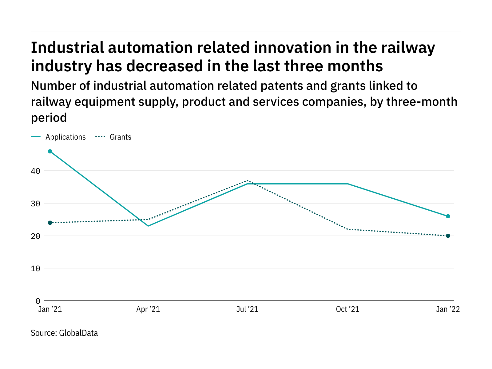 The most recent figures show that the number of industrial automation related patent applications in the industry stood at 26 in the three months ending January – down from 46 over the same period in 2021.