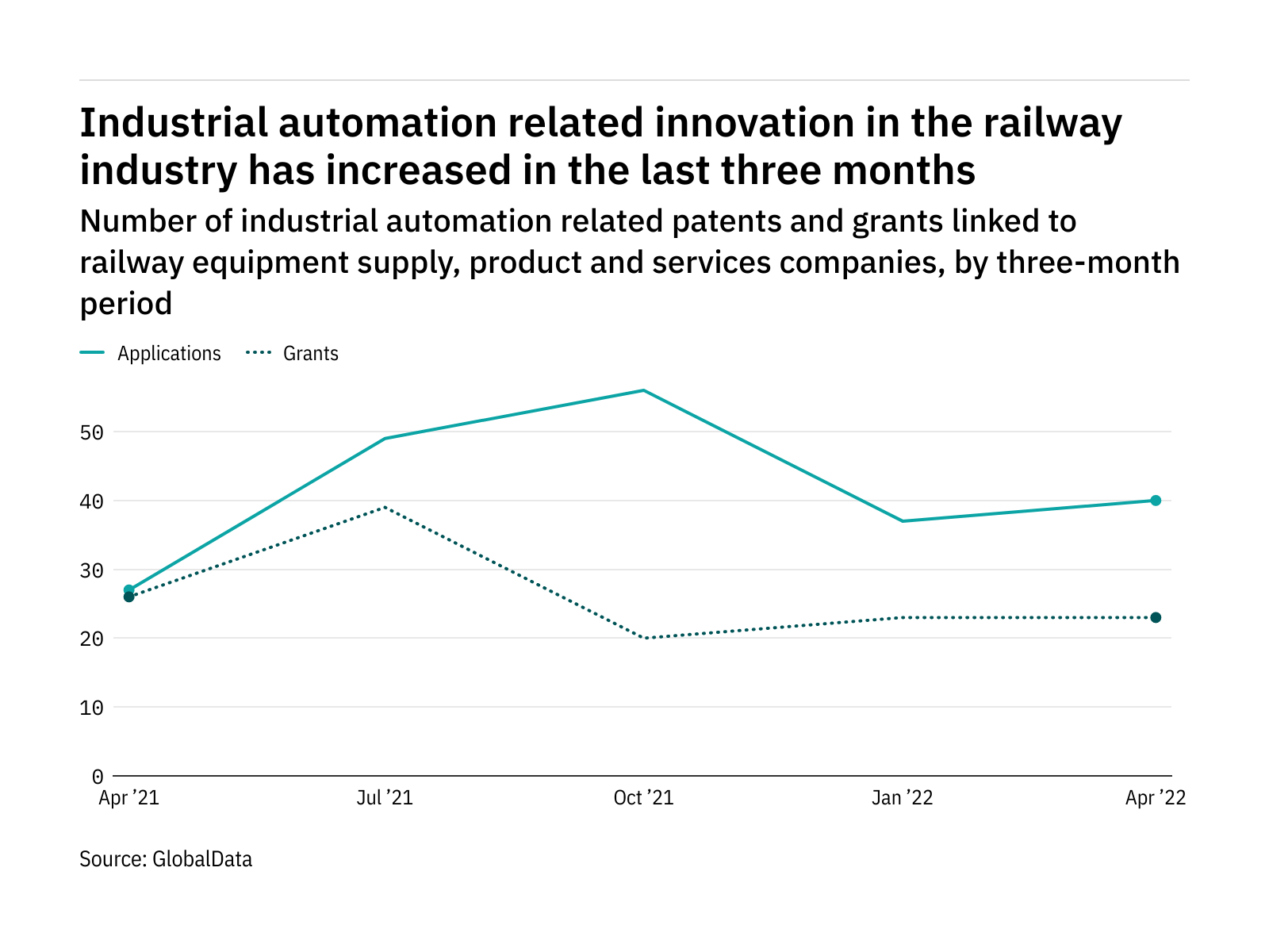 The most recent figures show that the number of industrial automation related patent applications in the industry stood at 40 in the three months ending April – up from 27 over the same period in 2021.