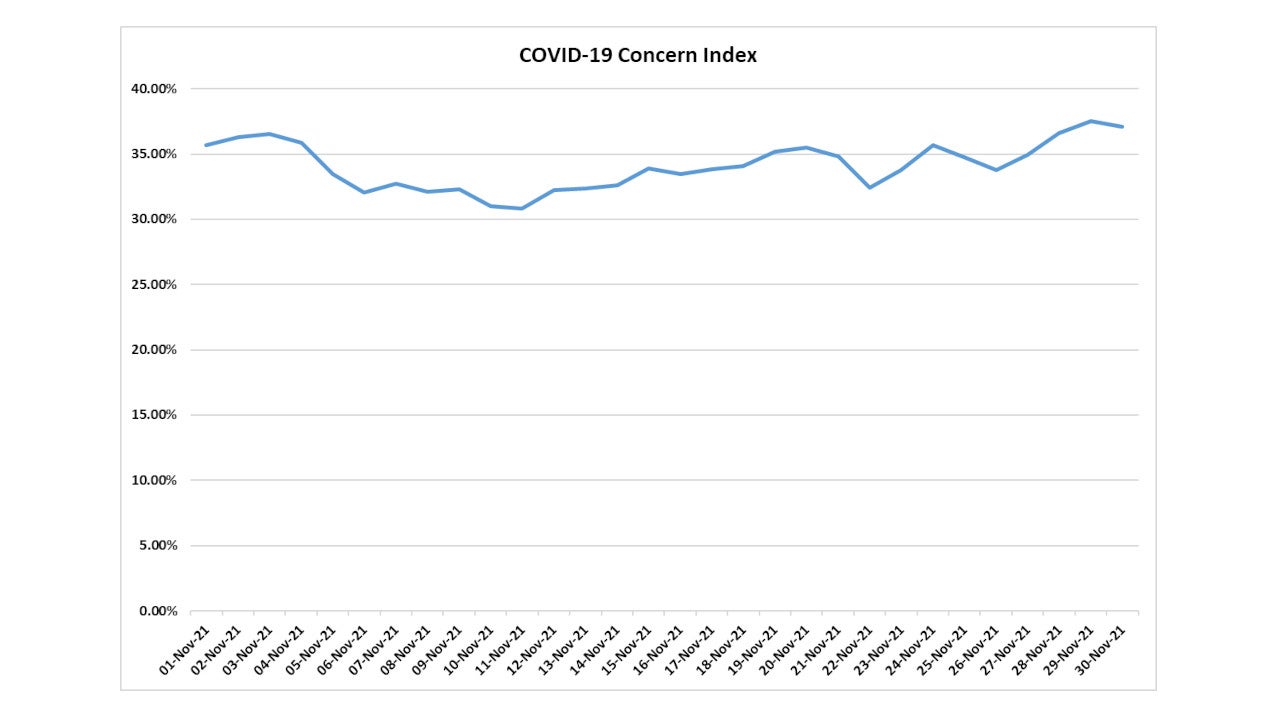 The health concern over COVID-19 in November averaged at 34% continuing its downward trend for three months in a row from 45.6% in August, 41% in September and 35% in October. The concern during the first week of November averaged at 34.6% compared to 35.1% in the last week of October. All regions reported either decreasing or stable trends in the number of new COVID-19 cases and deaths between 01 November and 07 November except the European region, according to the World Health Organization (WHO).