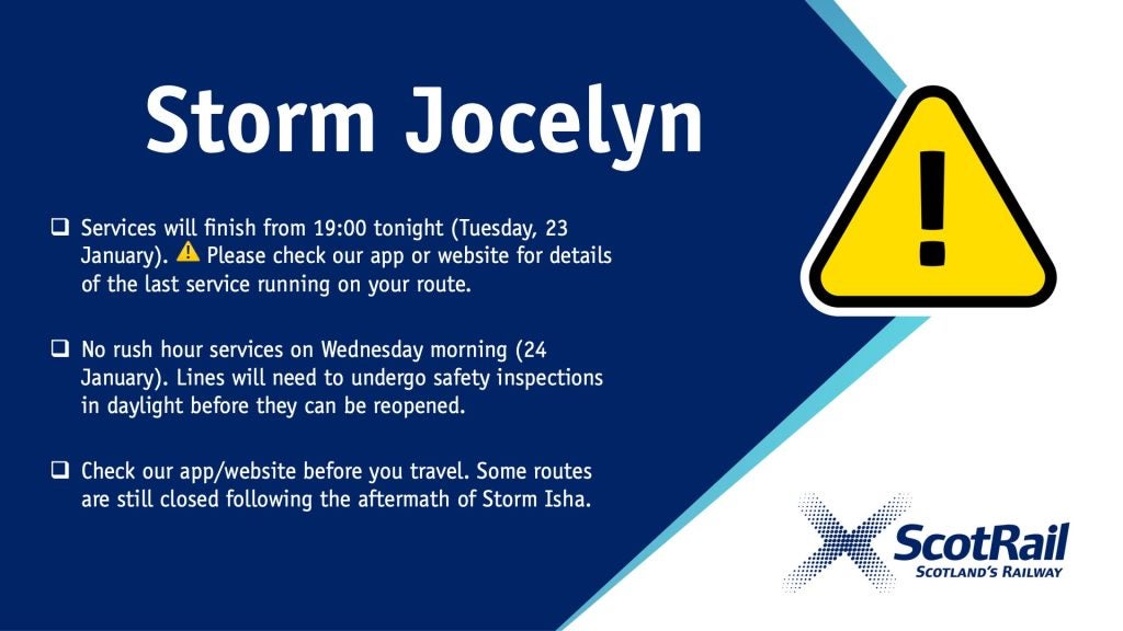 ScotRail said it would suspend all services – and published the times of the day’s final trains on its social media profiles – before the expected high winds and rain of Storm Jocelyn hit.