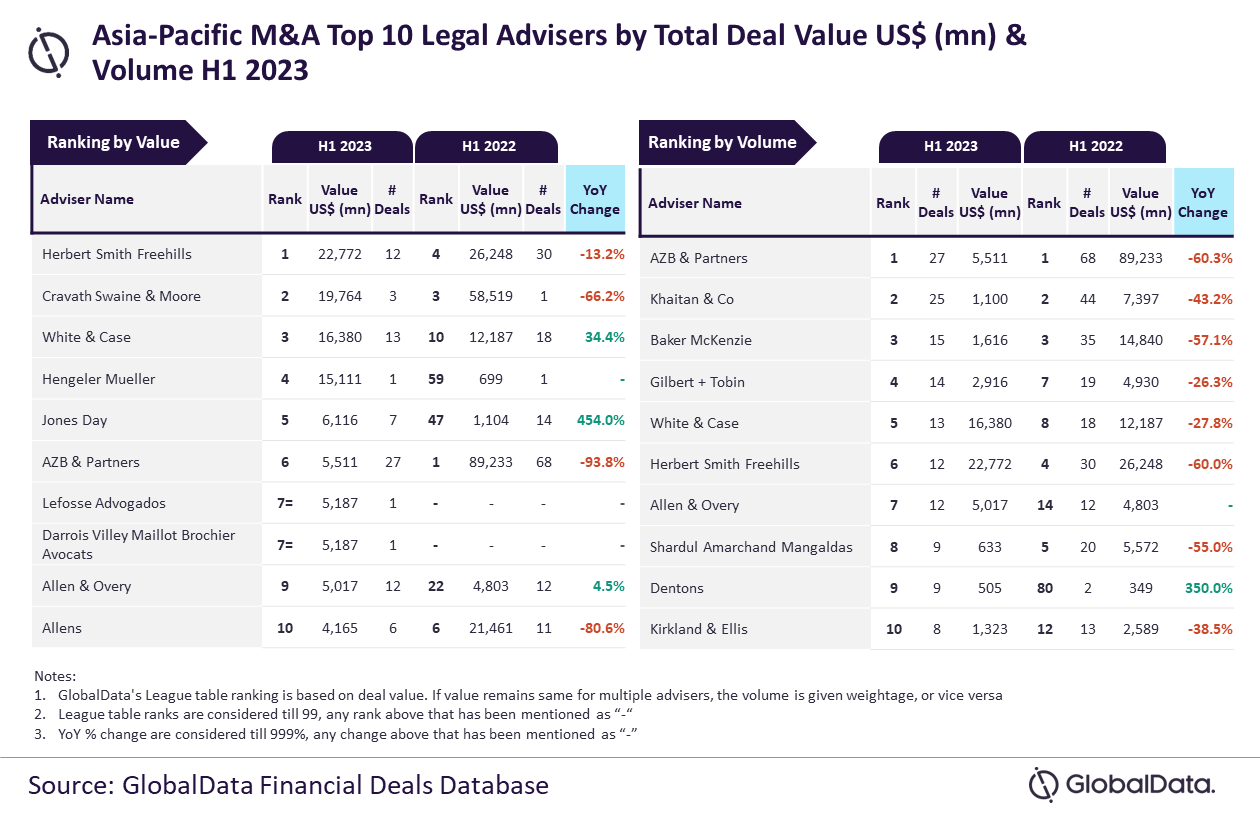 Herbert Smith Freehills and AZB & Partners were the top mergers and acquisitions (M&A) legal advisers in the Asia-Pacific (APAC) region in H1 2023, according to GlobalData’s latest league table.