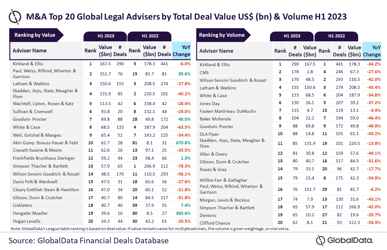 According to its financial deals database, Kirkland & Ellis took the leading position in rankings by both value and volume, after advising on 290 deals worth a total of $167.5bn in H1 2023.