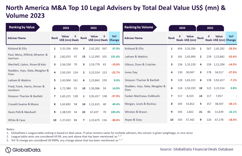 Kirkland & Ellis was the top mergers and acquisitions (M&A) legal adviser in the North American region in 2023 by both value and volume, according to the latest legal advisers league table by GlobalData, which ranked legal advisers by the value and volume of M&A deals on which they advised.