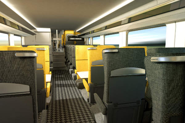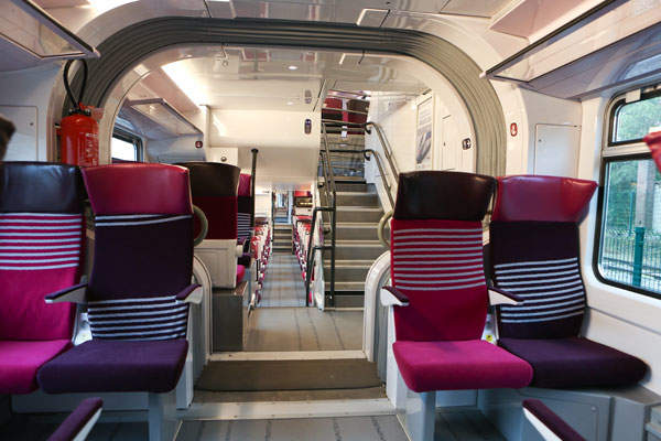 An intercity version comes with 650mm seats arranged in 2+1 configuration with interior doors, luggage space, increased toilet capacity, larger seat pitch, armrests, individual reading lights and electric sockets, and footrests.