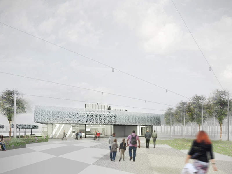 The exit from the station building leads to a large (50m x 29m) public space and a covered cycle storage area to the south of the station with a 6m-high tooth roofline accommodating solar panels on the transparent roof.
