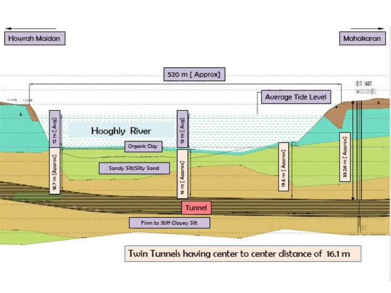 The underground tunnel will cross the Hooghly river for approximately half a kilometre necessitating a 520m underwater section of the tunnel making the East-West Metro tunnel the first underwater tunnel in India. The underwater tunnel will be at a depth of 13m below the water while the depth of the tunnel crown extra-dose will be 13m below the riverbed.