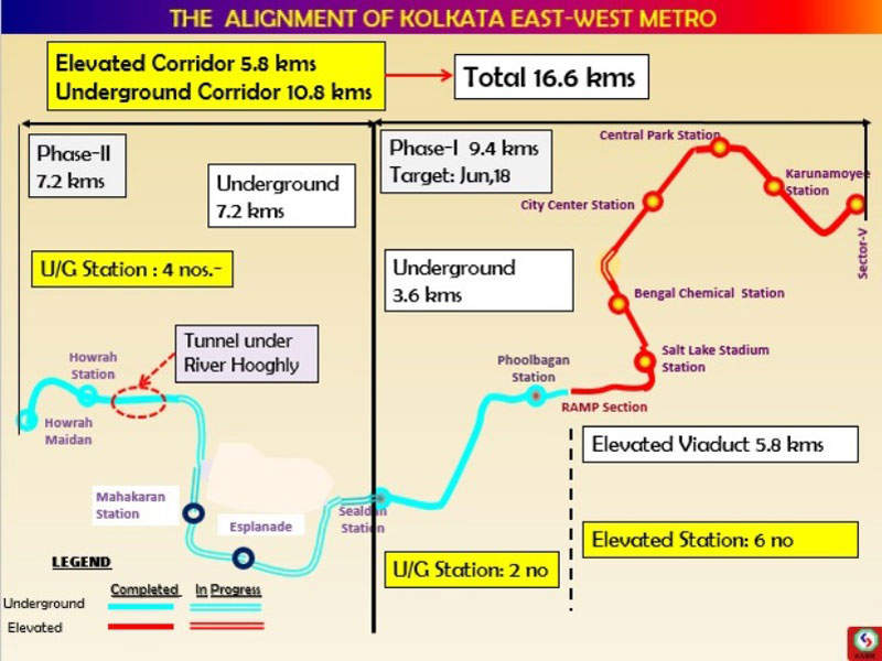 The underground section of the East-West Metro project stretches from Phoobagan and Howrah Maidan. The stretch will have a total of six underground stations at Phoobagan, Sealdah, Esplanade, Mahakaran, Howrah and Howrah Maidan. The tunnel will cross the Hooghly river between Mahakaran and Howrah stations.