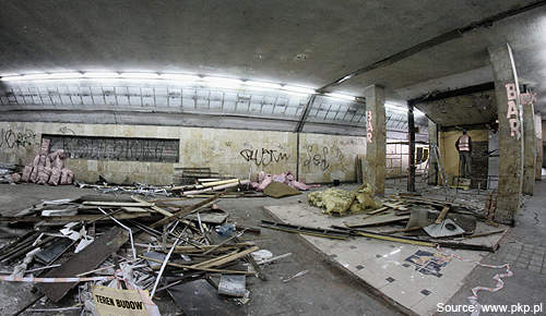 The station was built in 1972 and is currently being demolished due to the poor condition of its cup-shaped pillar structures. In June 2009, PKP SA (Polish State Railways SA) unveiled plans for modernisation and commercialisation of railway stations in the future.