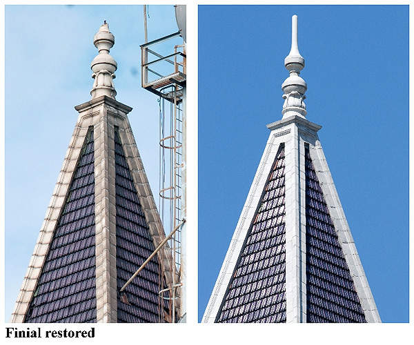 The construction was divided into many phases. The initial phase of construction began in summer 2008 and was completed in July 2009. In this phase of construction, the roof of the station was fully restored by using new terra cotta tiles, the broken tiles on the pyramid above the clock were replaced with salvaged glass, and four clocks were repaired.