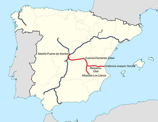 The line starts from Puerta de Atocha station and heads towards Cuenca and Motilla del Palancar. A branch line, which stretches to Valencia and Castellon, emerges from the main line at Cuenca. The main line heads towards Albacete and La Encina.