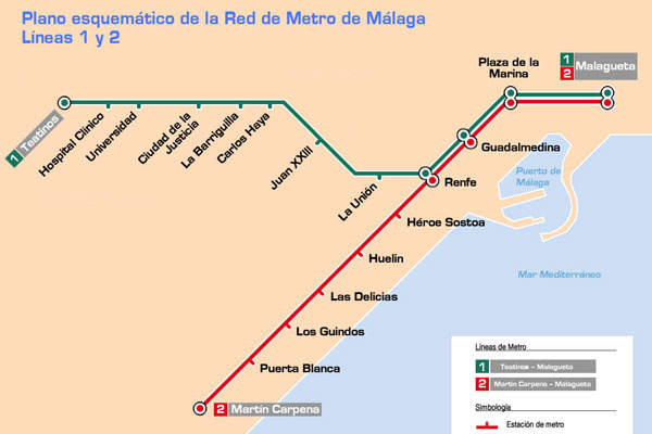 The Line 2 runs 4.6km along the coastal belt from Palacio de los Deportes to El Perchel and is completely underground. It has seven stations, including the one shared with the Line 1 and provides easy access to populated places such as Carretera de Cádiz and the Jose Maria Martin Carpena Arena.