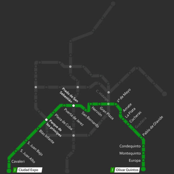 The first line of Seville Metro connects Ciudad Expo in the south-west to Condequinto in the south-east. It is 18km long and covers 23 stations, of which nine are above-ground, three are half-sunk and 11 are underground. It links the Municipalities of Mairena del Aljarafe, San Juan de Aznalfarache, Seville and Dos Hermanas.