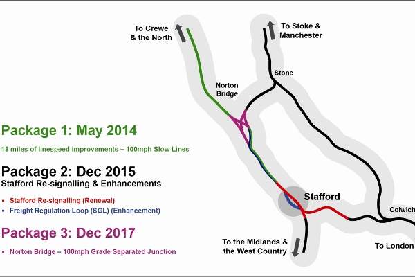 In addition, bi-directional signalling for platforms 4, 5 and 6 will be installed, and the line speed between Great Bridgeford and Stafford will be increased from 75mph to 100mph.