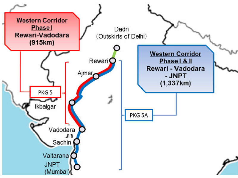 The Western dedicated freight corridor will cover a distance of 1,483km (928mi) of double-lane electric track from JNPT to Dadri passing through Vadodara, Ahmedabad, Palanpur, Phulera and Rewari. It will run parallel to existing line through Narnaul and Ringas.